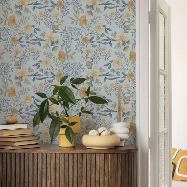 Tapet Flori galbene și albastre cu frunze pe un fundal albastru ca cerul Nr. a00934
