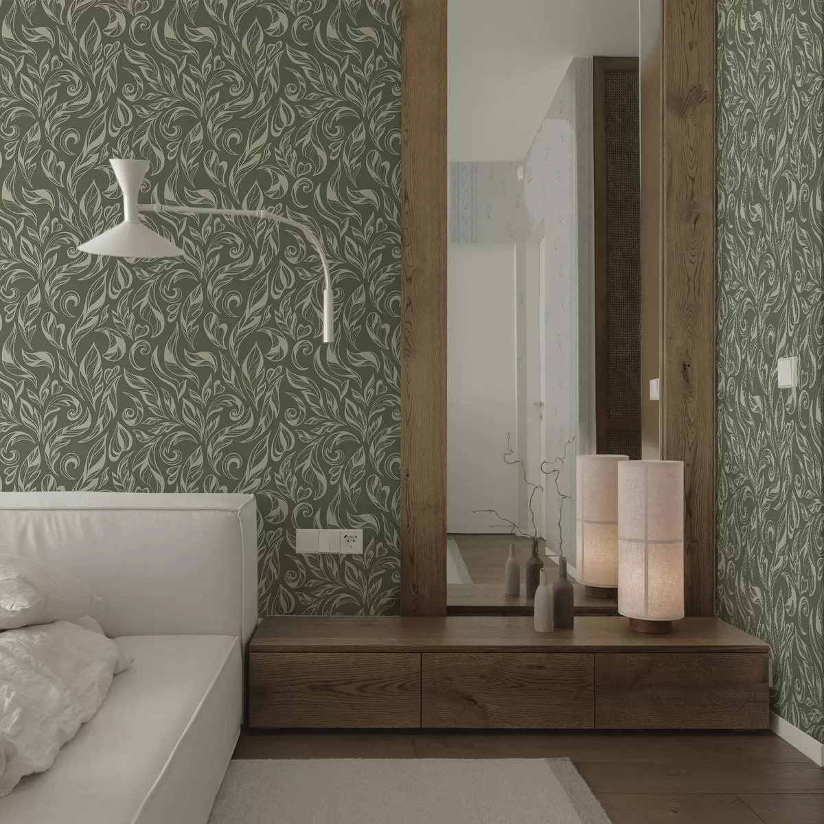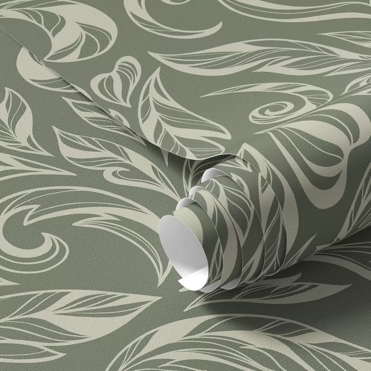Tapet Ornament frunze crem pe fond verde-cenușiu Nr. a00940v2