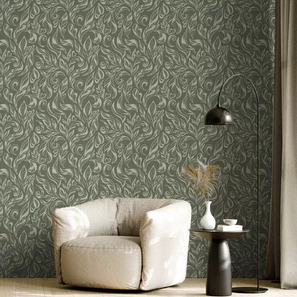 Tapet Ornament frunze crem pe fond verde-cenușiu Nr. a00940v2