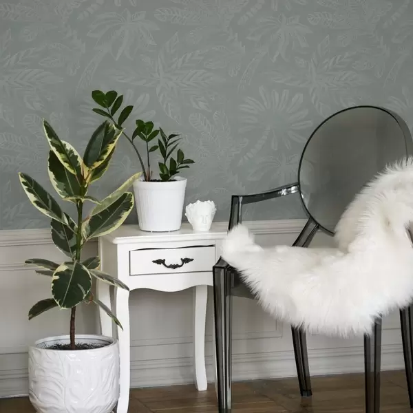 Tapet Frunze tropicale mari, mate, într-o paletă de culori gri-mentă Nr. a01001