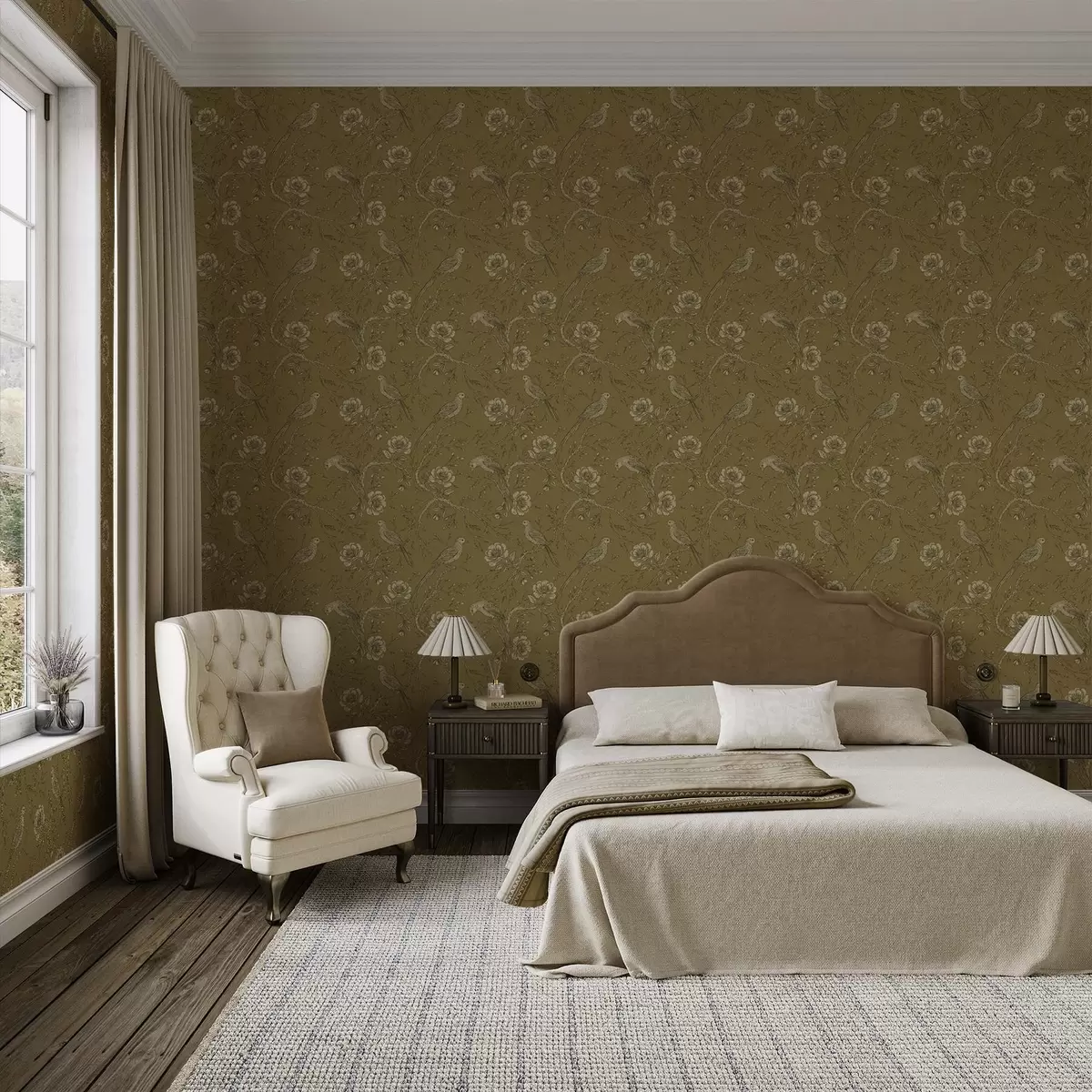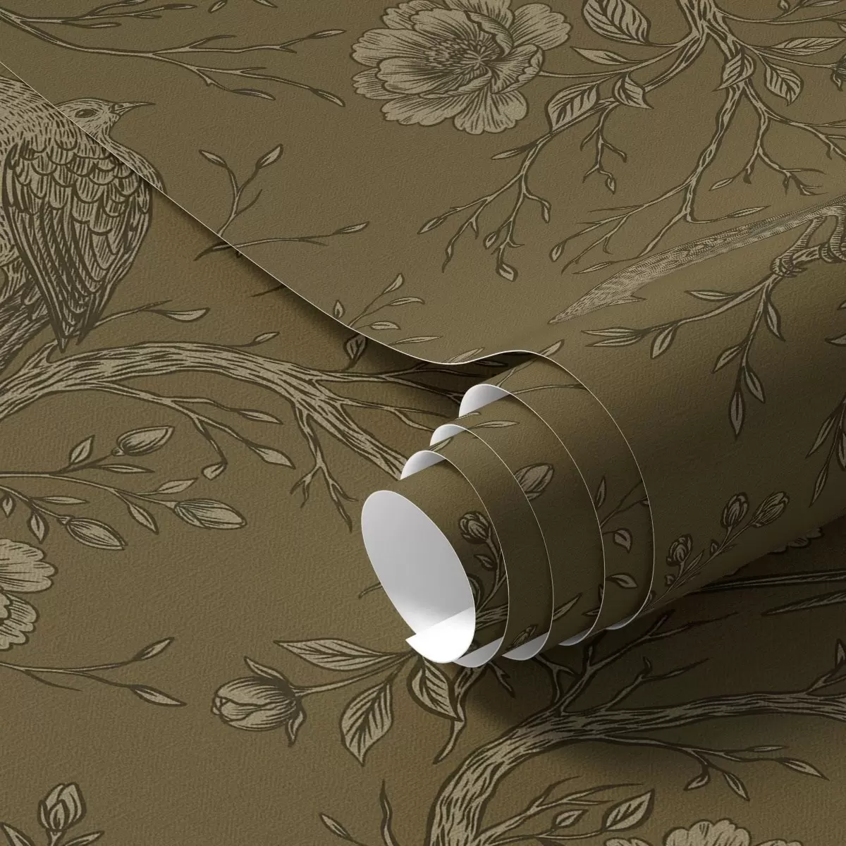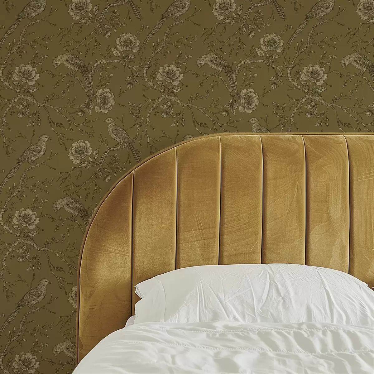 Tapet Păsări și flori vintage pe un fundal cald de culoarea măslinului Nr. a01022v1