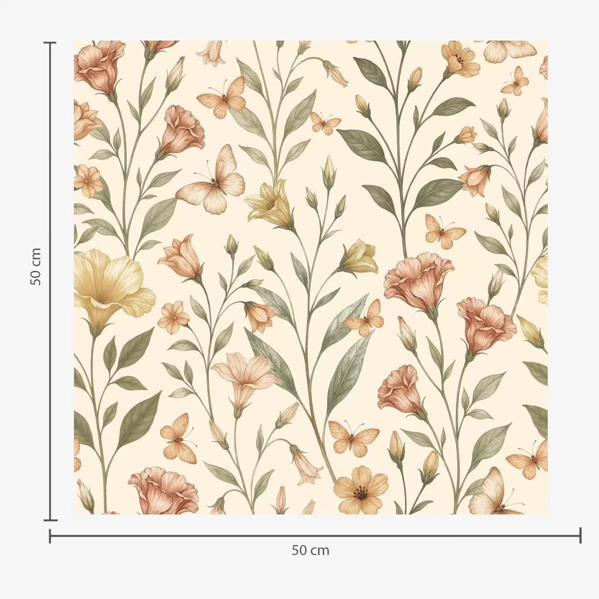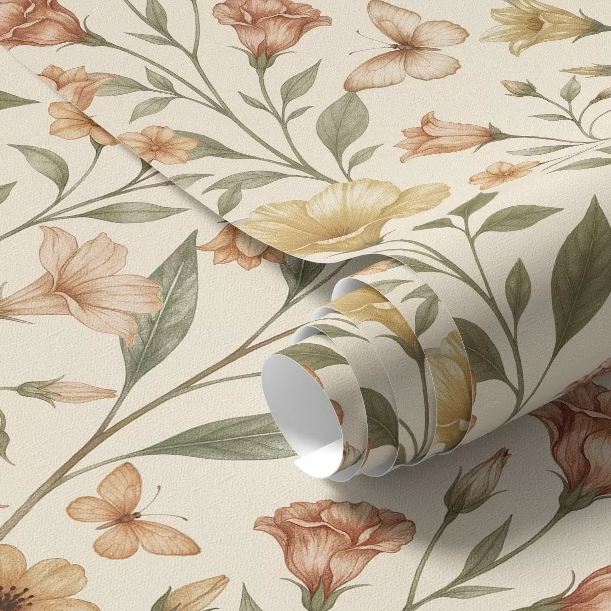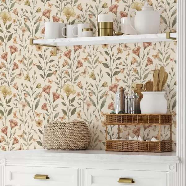 Tapet Flori delicate de piersic și fluturi pe un fundal crem cald Nr. a01026