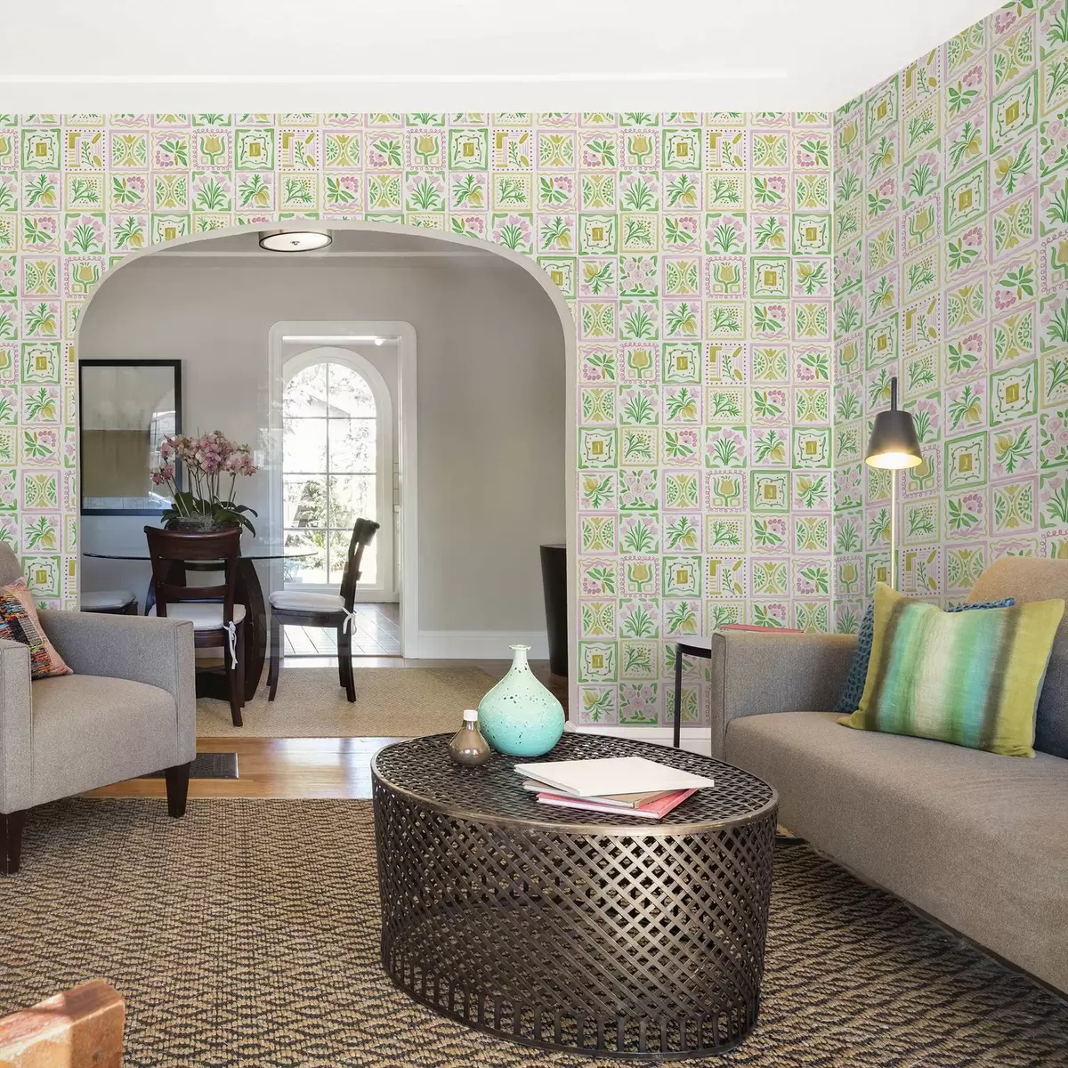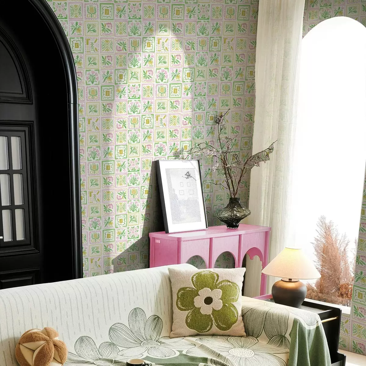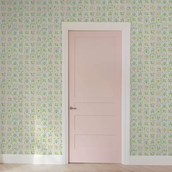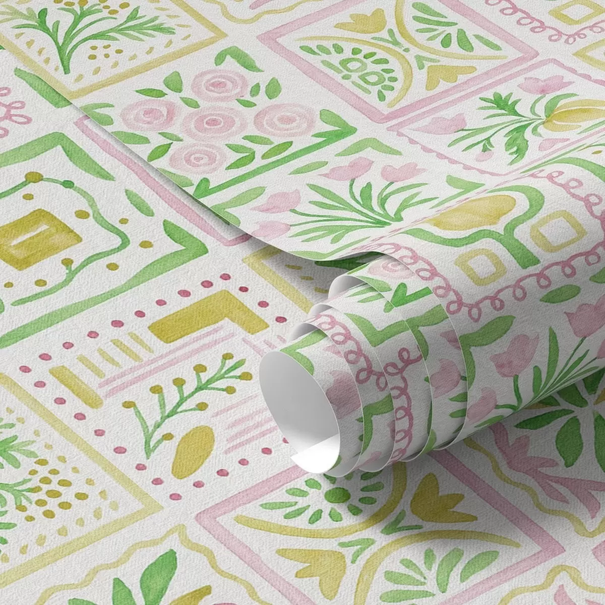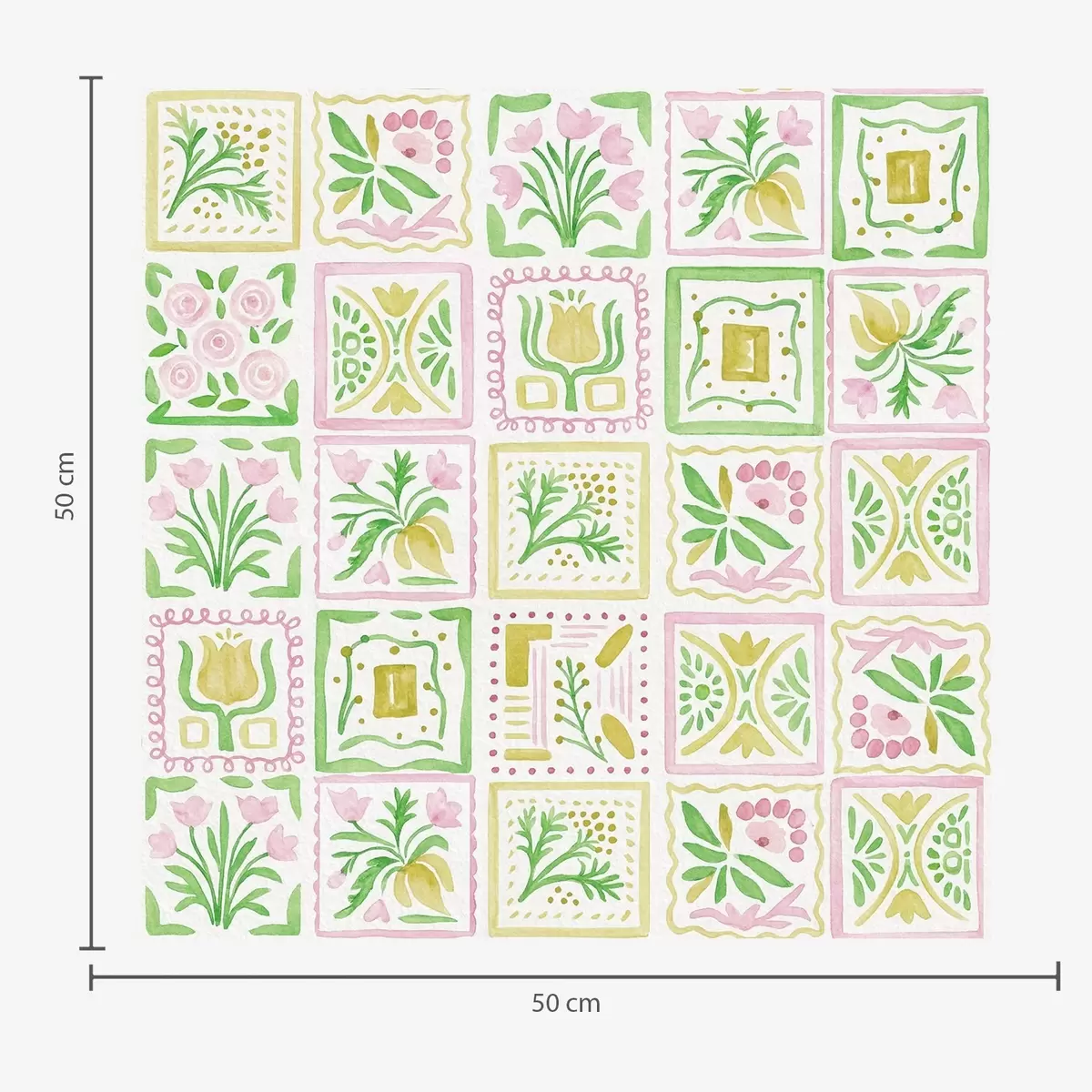 Tapet Pătrate acuarelate cu ramuri roz și verzi Nr. a01082